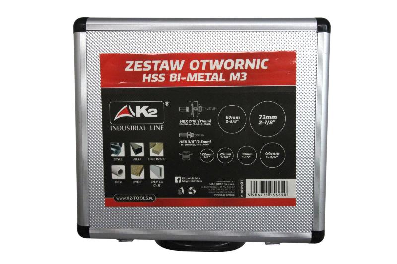 Juego de coronas K2 HSS Bi-Metal con diámetros de 12-73mm. Perfora hasta 44mm de profundidad en acero, aluminio, madera y PVC. Dientes con 8% cobalto para máxima durabilidad. Base hexagonal para fijac